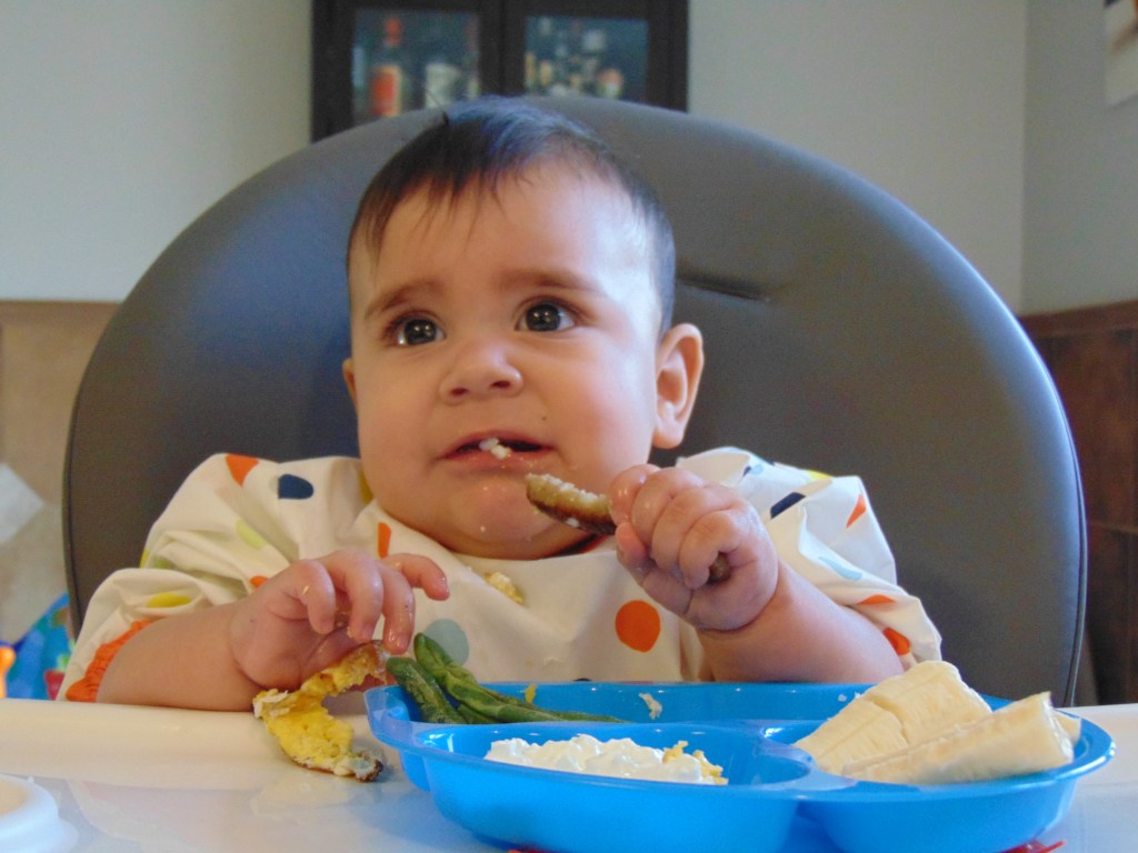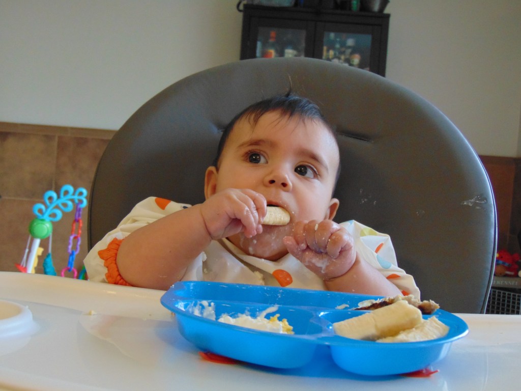 And of course the first thing she went for was the pancakes as her other hand discovered the whipped cream. She was tentative at first, since this is the softest pancake she’s had yet (crepes are in our future) but she soon discovers that it tasted good.