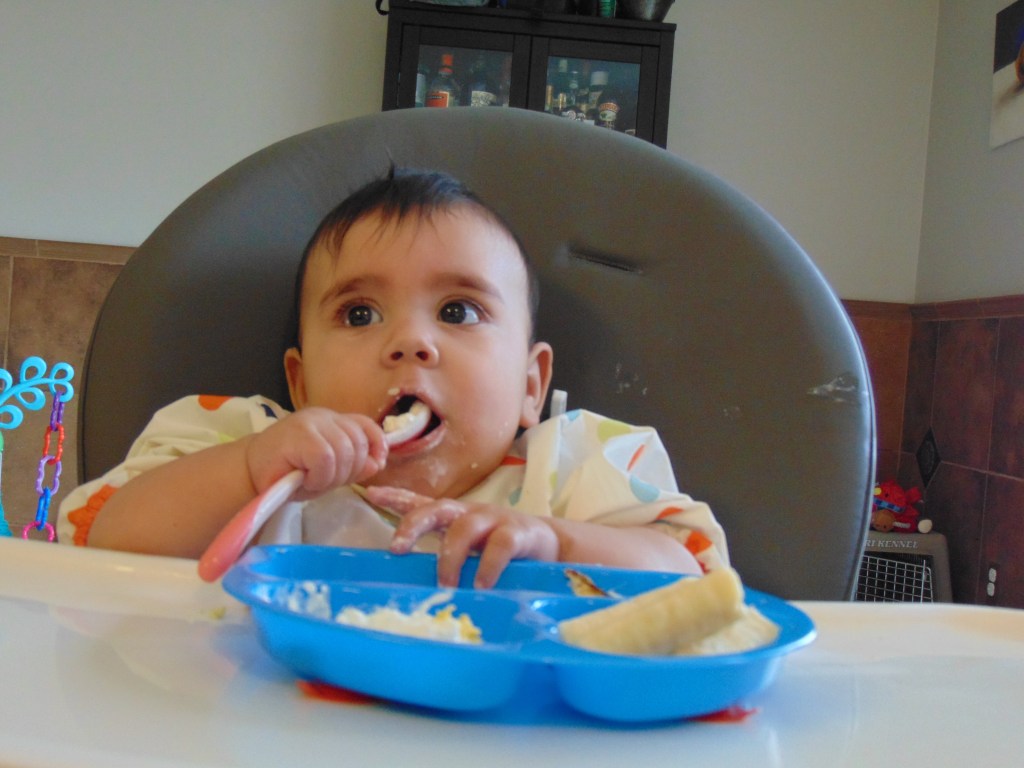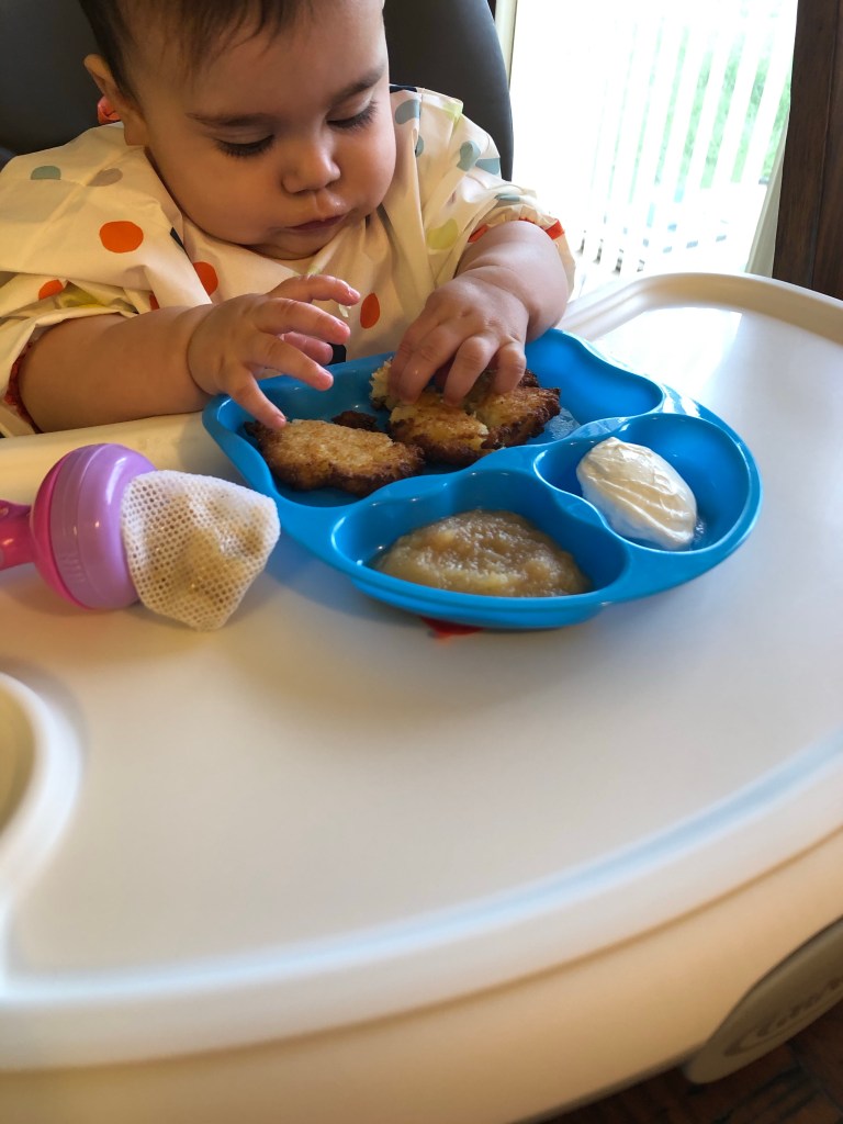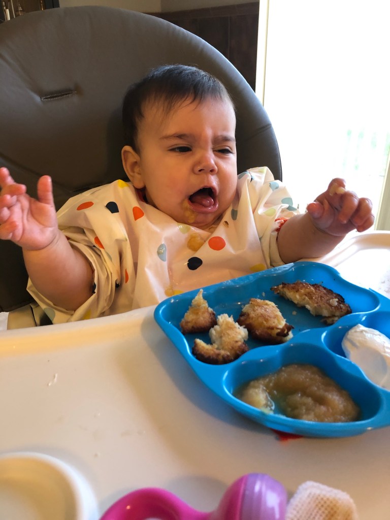 I also made my own mixed berry compote. I just tossed about a cup of frozen mixed berries into a sauce pan and heated on high until bubbly. Then I mashed up the berries to make a smoother texture and let it simmer on low until it thickened some. In the future I’ll probably play with this some. Add in some spices and what not to see what Malina likes, but spoiler alert: she loved the berries as is.