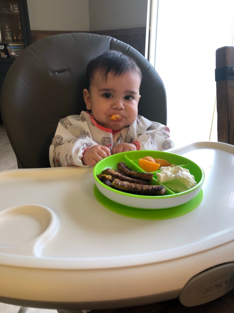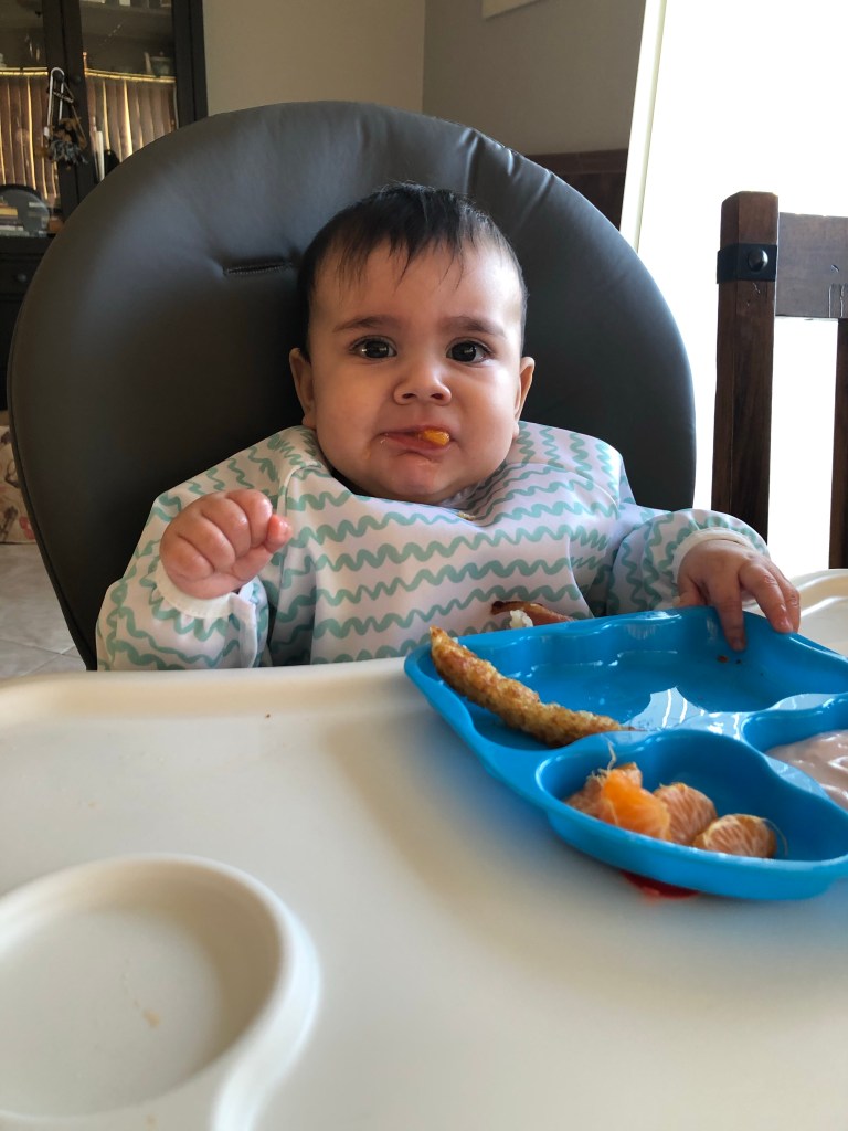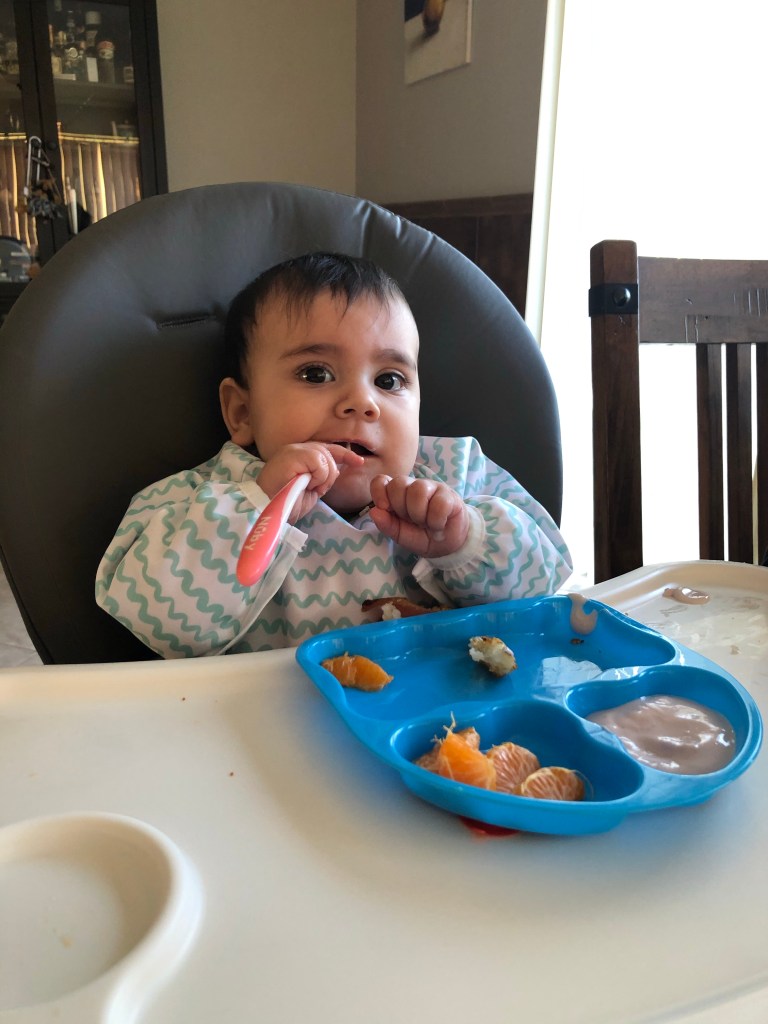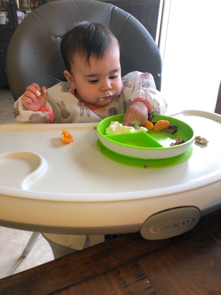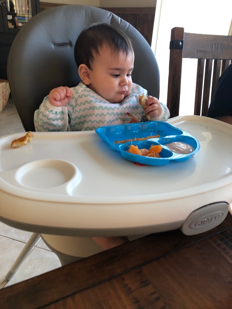 The next thing that Malina decided to eat were her mandarin oranges. She’s been enjoying snacking on them and having them with her breakfasts so far. Plus, I have a ton of them so when I need quick fruit right now I’m giving her these. She still chews on them to get the juice and discards the pulp though.