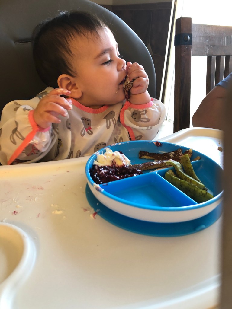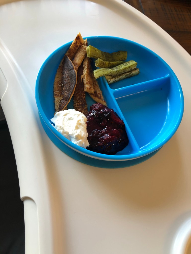 Malina was not pleased with the fritters. She was actually so upset that she threw them at me and proceeded to throw the rest of her food until she only had strawberries left. At least she looked happy as she did it.