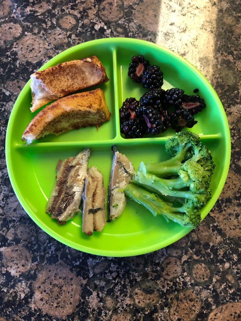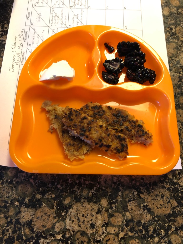I did food prep yesterday and had breakfast ready to go with little to do this morning. since we’re doing the peanut allergen I made peanut butter muffins from one of my BLW cookbooks. I made a batch of 24 mini muffins and froze half of them for later. I also made corn fritters.